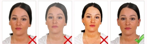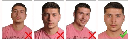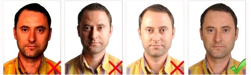 Başın konumu dik olmalı, baş herhangi bir yöne dönük olmamalıdır. Fotoğraf gülme vb. mimikler olmadan, ağız kapalı olarak çekilmelidir.